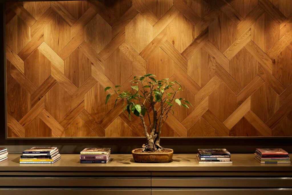 To have a unique look of wooden flooring we can combine different material and geometric patterns such as light flooring and dark furniture, also adding different patterns such as herringbone or chevron to have a twist in a modern look.